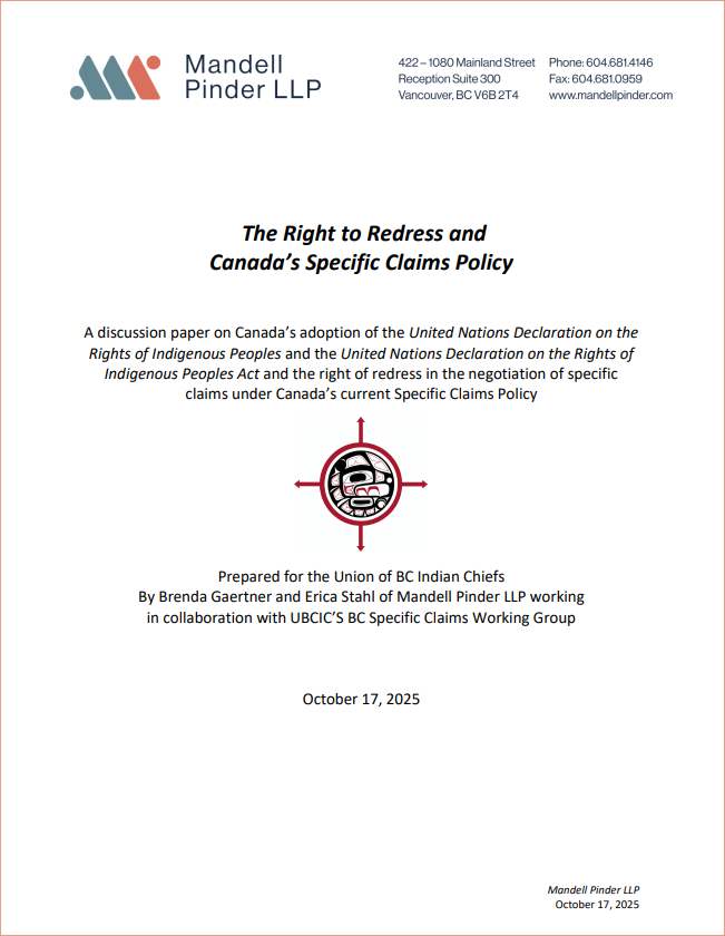 The Right to Redress and Canada’s Specific Claims Policy is a discussion paper written by Brenda Gaertner and Erica Stall in partnership with UBCIC’s BC Specific Claims Working Group. It provides incremental steps that Canada can take now to bring the negotiation of specific claims in better alignment with right to redress found in UN Declaration on the Rights of Indigenous Peoples.